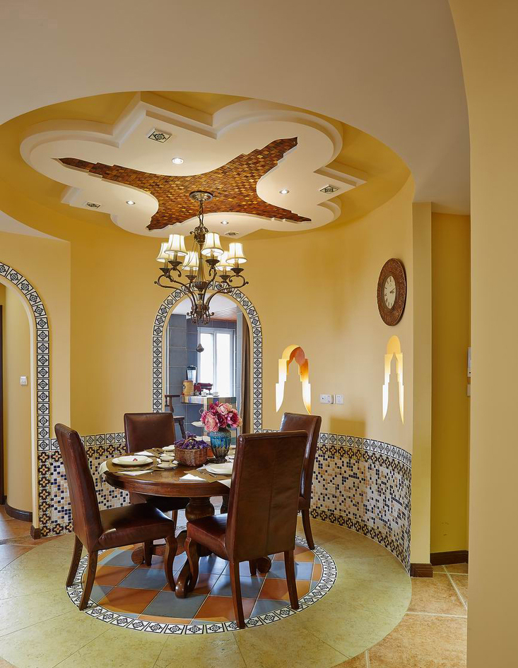 人們把摩洛哥這個稱為“北非花園”。具有異域風情的摩洛哥風格,裝飾華麗是它的特色。這個空間則以精致雕刻的線條,色彩活潑的瓷磚,創意獨特的吊頂,夢幻般神秘的臥室,令其充滿異國情調,又充斥著溫馨的氣息,它用自己獨有的顏色來表達對生活的熱情和歲月的沉淀。