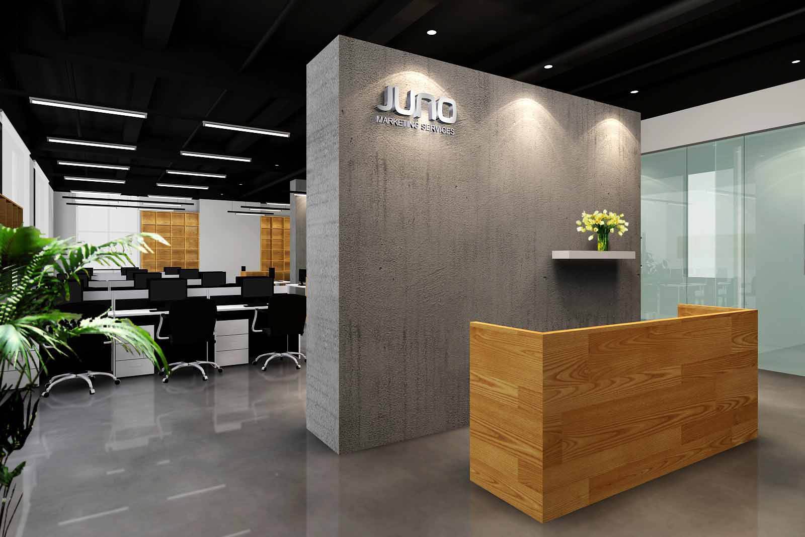 前臺燈光設計方案:辦公室前臺燈光設計亮度要夠而且一定要有聚焦在logo的字體上,這種整體前臺設計的效果才好。
